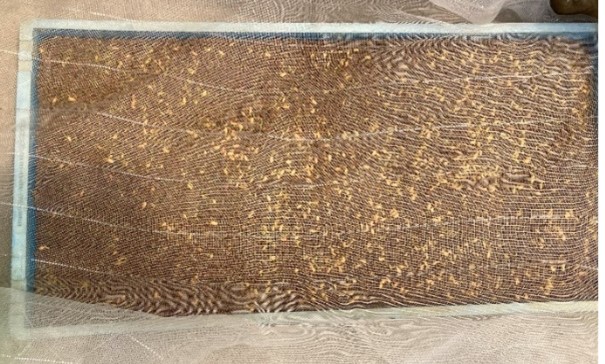 鳥よけのネットをかけた育苗箱で、すくすく成長しています。